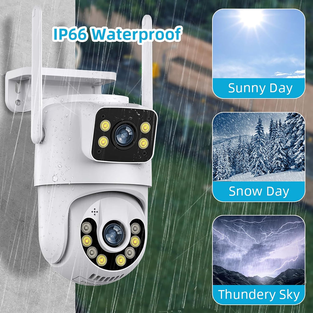 - 【Cámara PTZ de doble lente para exteriores】Cámara para exteriores Dosilkc con lentes duales de 0.110 in, una rotación horizontal fija y otra giratoria de 355°, vertical de 90°; proporciona una visión amplia de 360° casi sin puntos ciegos. Vista de pantalla dual: Al hacer clic en la pantalla de viñeta, la pantalla de la cúpula automáticamente posiciona y gira, localizando y fijando rápidamente el objetivo. Con zoom digital 4X para enfocar los detalles del objetivo.